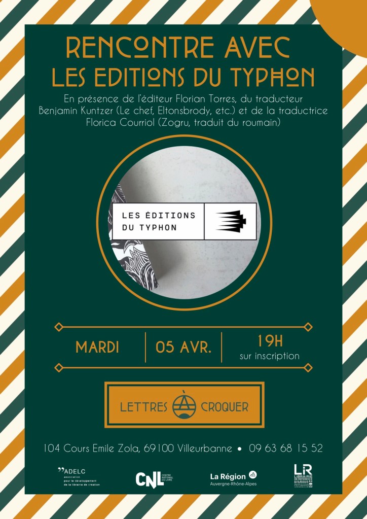 La première de ces rencontres a eu lieu aux Lettres à Croquer, une super librairie villeurbannaise que je ne connaissais pas, mais dont je te recommande chaudement la découverte si tu te trouves dans la même situation (sinon, je te félicite, tu as très bon goût). Mathilde et son équipe soutiennent apparemment depuis le début les éditions du Typhon, pour lesquelles j’ai eu le plaisir et l’honneur de traduire Eltonsbrody et Le Chef. À ce titre, Florian Torres, l’un des éditeurs, était invité pour un focus sur une de leurs deux collections (Les Hallucinés) ; pour l’accompagner, deux traducteurs de bouquins parus au catalogue (bibi, et l’éminente Florica Courriol, traductrice du roumain (et du français vers le roumain), et en l’occurrence de Zogru (Doina Rusti), dont je n’ai pas encore eu l’occasion de faire ma critique, mais qui devrait paraître ici sous peu (si la flemme me quitte)). Notre mission, puisque nous l’avions acceptée : parler de notre métier (et accessoirement répondre aux questions sur les bouquins qui nous concernaient). Et puisqu’on y passe l’essentiel de notre temps, c’est à vrai dire un sujet assez facile à développer, surtout quand l’auditoire est passionné de lecture (ce qui est souvent le cas lors des rencontres en librairie en pleine soirée). On a même pu aller manger un morceau entre éditeur et traducteurs (+ quelques proches triés sur le volet, comme le mari de Florica et les partageurs de vie de son collègue impressionné). L’occasion pour moi de confirmer ce que je savais déjà : traduire de l’anglais et traduire d’une langue dite rare sont deux activités pas tout à fait aussi différentes que le tennis et le badminton, mais pas loin – la forme des raquettes et du projectile varie, la taille du terrain aussi, et si le principe de base reste le même (renvoyer la baballe), les règles sont très différentes. En l’espèce, les traducteurs de langues « rares » (grosso modo, toutes les langues sauf l’anglais, avec l’espagnol, l’allemand voire l’italien qui jouent un peu sur les deux tableaux) font aussi bien souvent office d’agents, d’apporteurs de projets, de lecteurs, de conseillers éditoriaux, etc. On peut s’amuser à faire tout ça avec l’anglais aussi, mais le maillage est tel qu’à moins de connaître personnellement un auteur, il y a des chances que son projet ait déjà été présenté à un éditeur français avant même que tu en découvres l’existence. Par ailleurs, l’immense majorité des éditeurs ont un niveau d’anglais suffisant pour comprendre un texte et s’en faire une idée, ce qui est, avouons-le, beaucoup moins le cas pour le roumain ou le chinois. Bref, j’aurais adoré me plaindre de cette rencontre, mais ça m’est impossible parce que j’ai vraiment passé une très bonne soirée et appris plein de choses (cœur avec les doigts pour femme et enfants qui ont supporté avec une infinie sagesse les longs débats, surtout à une heure aussi avancée de la journée en pleine semaine et en sortant du travail/de l’école).