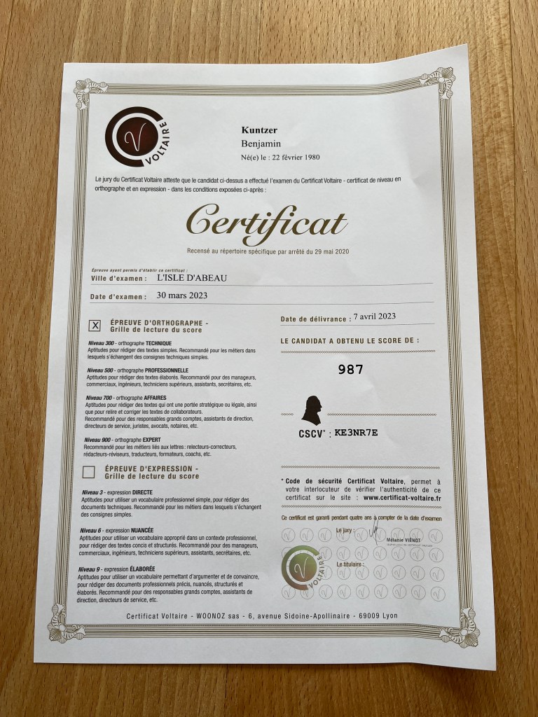 Comme j’ai tendance à m’ennuyer, que les semaines sont toujours trop longues et que j’ai largement le temps de faire tout ce que j’ai envie de faire, j’ai jugé bon de m’occuper un peu en préparant (avec beaucoup d’assiduité) le Certificat Voltaire. Autre façon de voir les choses : j’aime me lancer les défis, j’ai un côté nerd, et j’ai fini par aimer étudier, bien après avoir terminé mes études. Ça peut paraître idiot, mais j’ai le sentiment d’avoir fait toute ma scolarité beaucoup trop tôt, quand je n’étais pas assez mûr pour ça, et que je prendrais aujourd’hui beaucoup plus de plaisir à tout recommencer (bon, peut-être pas tout : malgré tout le respect que je peux avoir pour Mme Goyard et mes différentes profs d’allemand – je n’ai eu que des femmes –, je continue à faire un vrai blocage ; même si, curieusement, j’ai l’impression de mieux le comprendre et le parler aujourd’hui, alors que je n’ai plus suivi de cours depuis 20 ans, comme si ça avait toujours continué à infuser en tâche de fond). De toute évidence, mon parcours scolaire est un paradoxe ambulant : jusqu’au bac, j’ai toujours été qualifié de « scientifique », sans jamais vraiment trouver d’intérêt ni comprendre les matières concernées. Et depuis le début de ma carrière « littéraire », je cherche des chiffres partout (nombre de signes, pourcentages, coefficients… Sans compter les calculs pour retrouver, au choix, mon salaire brut, mon net imposable, ma CSG déductible et j’en passe, surtout quand les éditeurs ne m’envoient pas les documents requis, mais j’y prends peu de plaisir). Tout ça pour dire que le Certificat Voltaire me permettait de concilier ces deux aspects : une note chiffrée et objective sur des données purement littéraires (encore que je commence à piger le sens de la grammaire depuis que je l’aborde sous un angle logique et mathématique, mais c’est un autre problème).